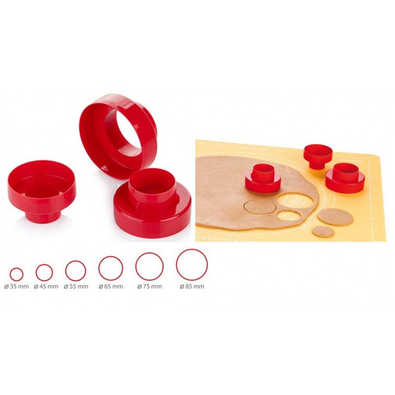 Ogni confezione contiene tre stampini tagliabiscotti ed ogni utensile ti permette di ottenere la tua forma preferita in due misure diverse, a seconda del lato che usi per tagliare la pasta: così potrai preparare biscottini e piccoli dolcetti, o addirittura deliziose crostatine! Prodotti in plastica resistente e colorata, sono pratici e sicuri anche per giocare in cucina con i tuoi bambini. à cerchi: da 3,5 cm a 8,5 cm