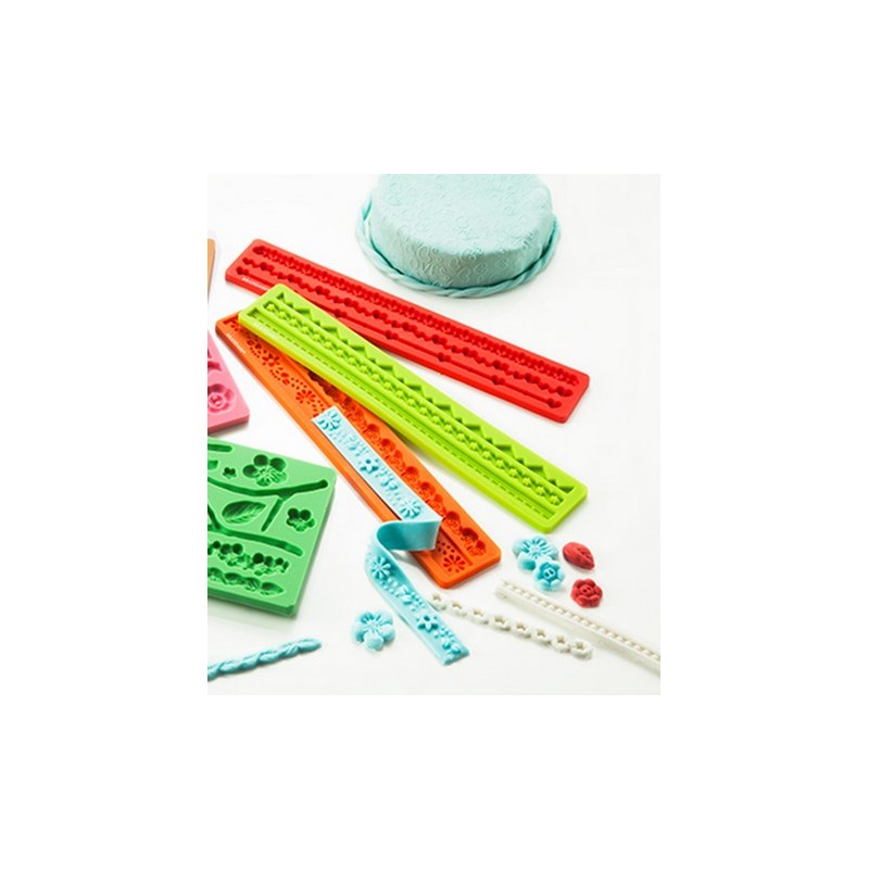 Stampo multiplo in silicone adatto alla creazione di decori in pasta di zucchero, marzapane, cioccolato. Ideale per bordi e rifiniture. Dimensione: 30x5cm Decoro: fiori Colore: arancione