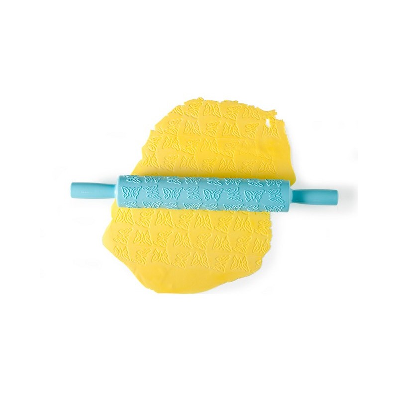 Mattarello azzurro in plastica per decorare la pasta di zucchero. Ideale per personalizzare i dolci. Decoro: Farfalle Diametro: 4,5 cm Lungh. 39,5 cm