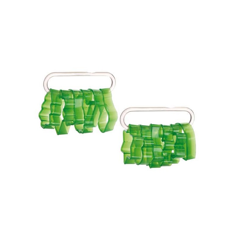 Il set contiene 12 tagliabiscotti in plastica, ganci in acciaio inox (50 pz) e 2 clip per conservare ordinatamente i tagliabiscotti; la clip serve anche per creare i fori sui vari biscotti. Le istruzioni per l'uso ed il ricettario sono inclusi all'interno della confezione.