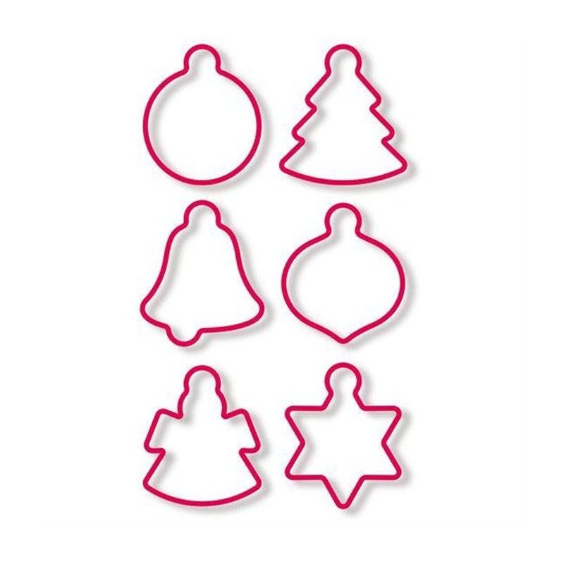 Il set contiene 6 tagliabiscotti in plastica, un nastro rosso lungo 5 metri, i ganci in acciaio inox (30 pezzi) ed una clip per creare il foro nell’impasto e per tenere in ordine le formine quando riposte. Un pratico ricettario è incluso nella confezione.