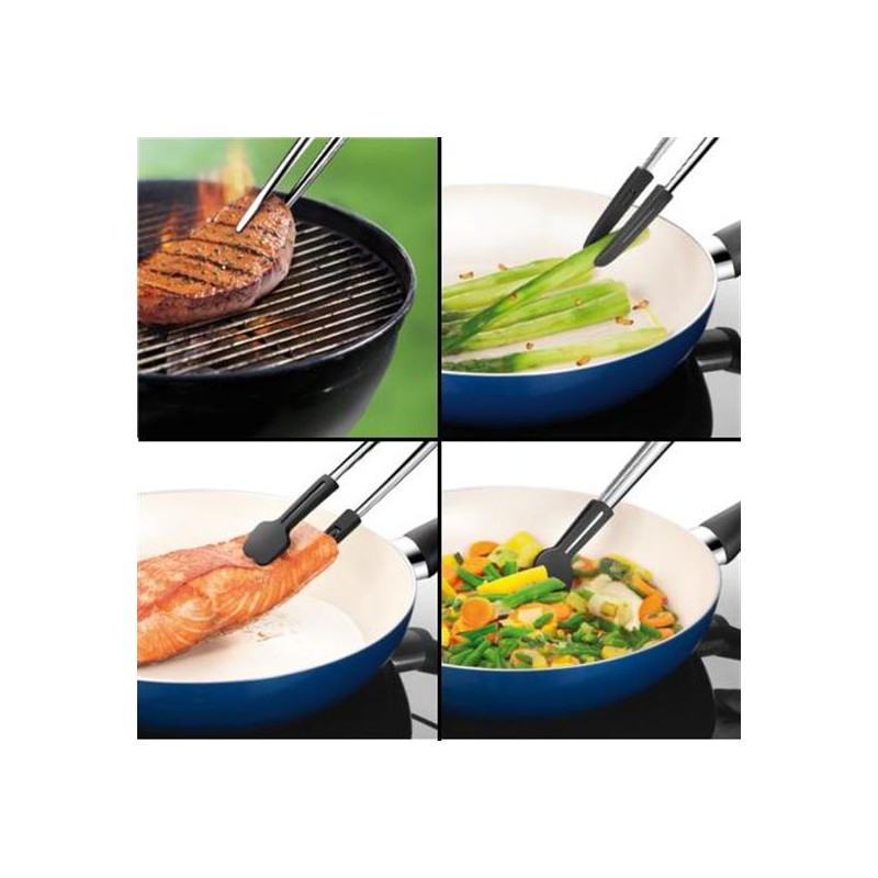Pinza da cucina in acciaio inossidabile di alta qualità provvista di 3 paia di punte intercambiabili in nylon resistente al calore. Ideale come pinza da cucina tradizionale, pinza larga e cucchiaione, adatta anche per essere utilizzata con pentolame antiaderente dato che non danneggia il rivestimento.
